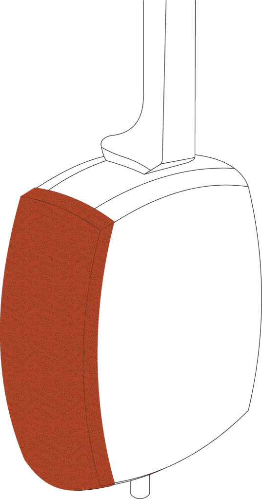 Small piece of skin or self-adhesive synthetic film used to protect the shamisen’s skin (kawa) from the bachi. Traditionally crescent-shaped and placed under the strings near the edge of the body. On Tsugaru Shamisen, it is rectangular and larger, extending protection toward the center of the skin.
